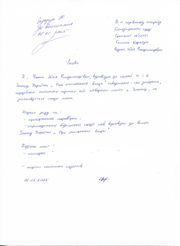 | Чорна Юлія Володимирівна | Головний спеціаліст | декларація | 08.01.2025 | заява | ні |